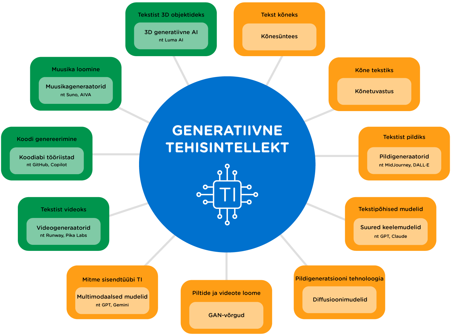 - Tekstipõhised mudelid (LLM-id) – suurte keelemudelite põhised süsteemid (nt GPT, Claude), mis suudavad luua teksti, vastata küsimustele ja koostada dokumente.