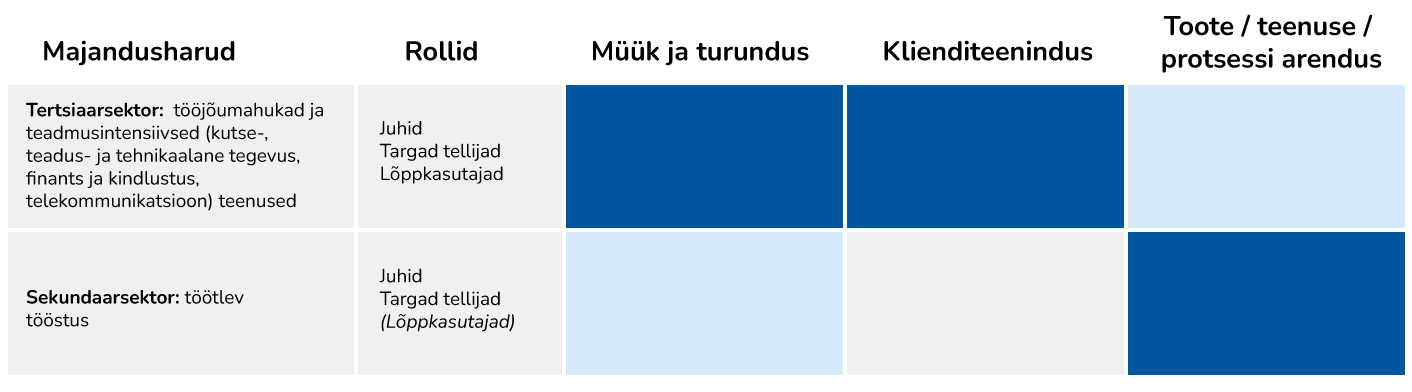 Uuringu eesmärk on kaardistada nii üldisemat laadi kui ka n-ö funktsioonipõhised TI-oskused, mida vajavad töötajad müügis ja turunduses, klienditeeninduses ning tootearenduses – aladel, mida on peetud suurima generatiivse TI rakenduspotentsiaaliga ärifunktsioonideks (Chui et al 2023). Tähelepanu all on ka rollid, mille kaudu TI-lahendused ettevõtetesse jõuavad: juhid, n-ö targad tellijad ja lõppkasutajad. Selline vaade ei aita mõista TI rakendamise mõju mitte üksnes tehnoloogilise võimekuse kasvatamise võtmes, vaid ka tööprotsesside ümberkujundamise ja organisatsioonisiseste otsuste kontekstis.