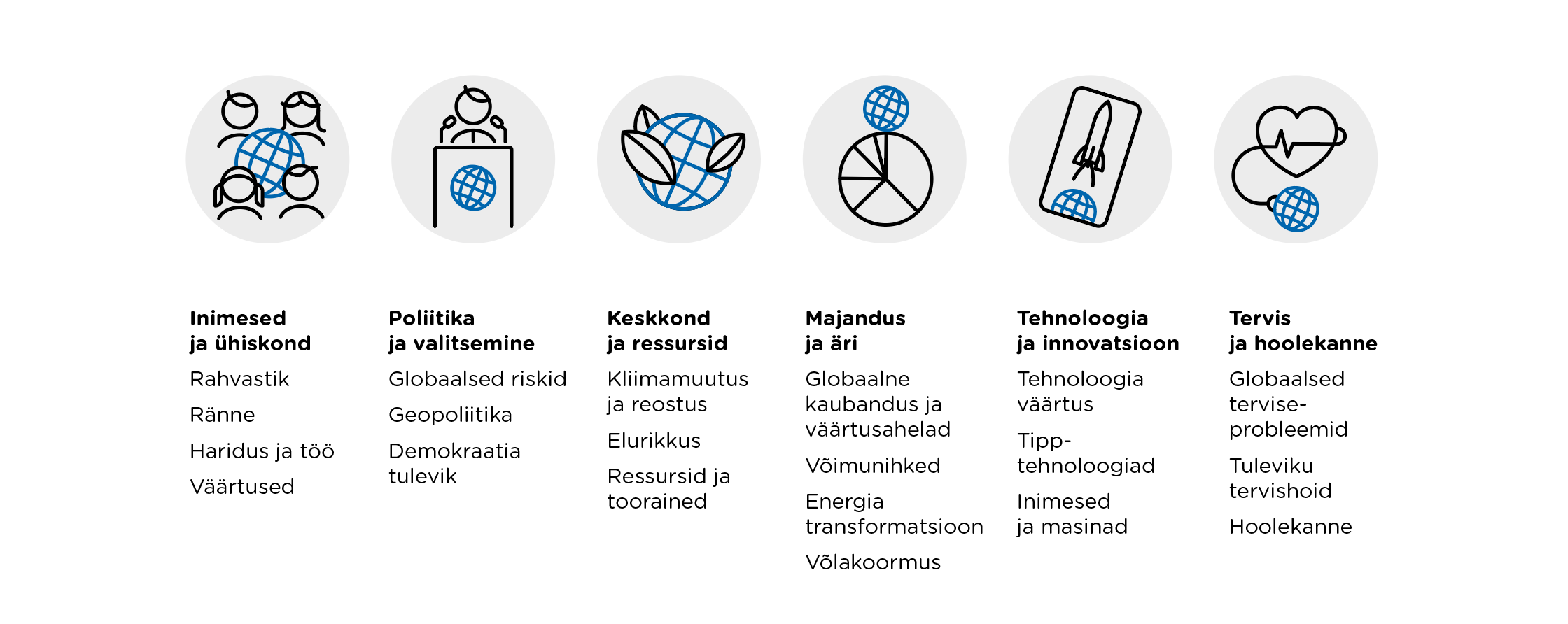 Joonis 1. „Trend Compendium 2050” käsitleb kuut valdkonda, kus megatrendide mõju aastani 2050 enim avaldub