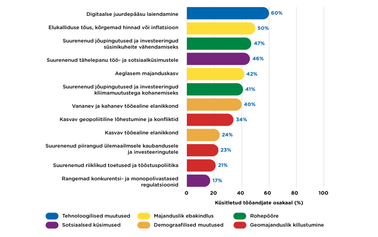 Joonisel 2 on toodud majandusega seotud trendid, mis tööandjate hinnangul majandustegevust kõige enam muudavad. Kolm kaalukamat trendi on digitaalse ligipääsu laiendamine, kasvav elukallidus ja kõrgemad hinnad ehk inflatsioon ning suurenevad pingutused ja investeeringud CO₂ heite vähendamiseks. Neile järgnevad kasvav tähelepanu tööjõu- ja sotsiaalküsimustele, aeglasem majanduskasv ning suurenevad pingutused ja investeeringud kliimamuutustega kohanemiseks.