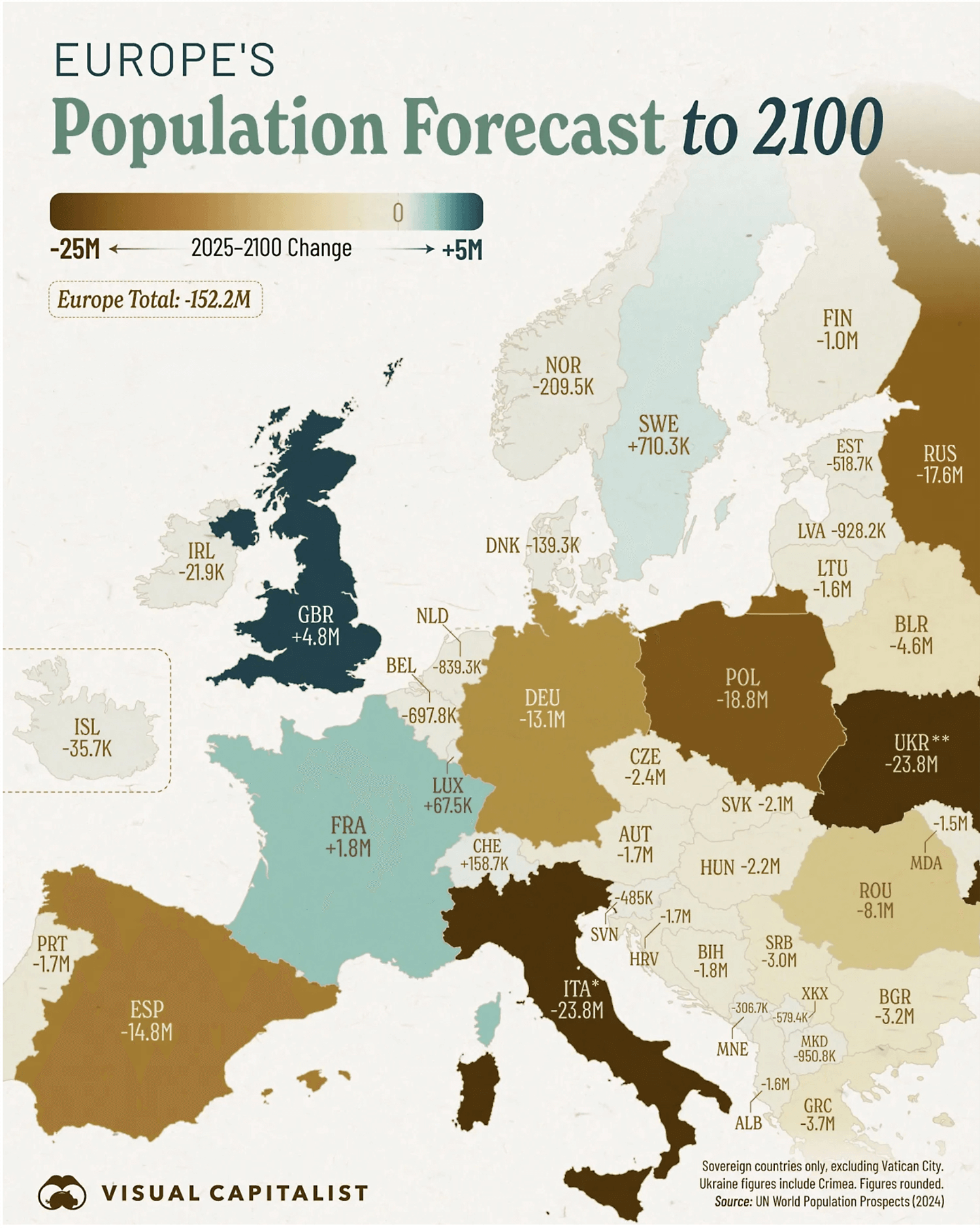 Erinevalt Põhja-Ameerikast, mille elanikkond peaks kasvama 75 miljoni inimese võrra, võib Euroopa Liidu 28 liikmesriigi rahvaarv jääda 2050. aastal pidama umbes 500 miljoni inimese juures, kaotades samal ajal 49 miljonit tööealist elanikku (vanuses 20–64). See arv tähendab, et potentsiaalselt aktiivseid töötajaid on näiteks Saksamaal vähem 11 miljoni võrra ning Hispaanias ja Itaalias 7–8 miljoni võrra. Samal ajal jõuab Prantsusmaa rahvaarvult järele Saksamaale – Ühendkuningriik tõenäoliselt veelgi varem.