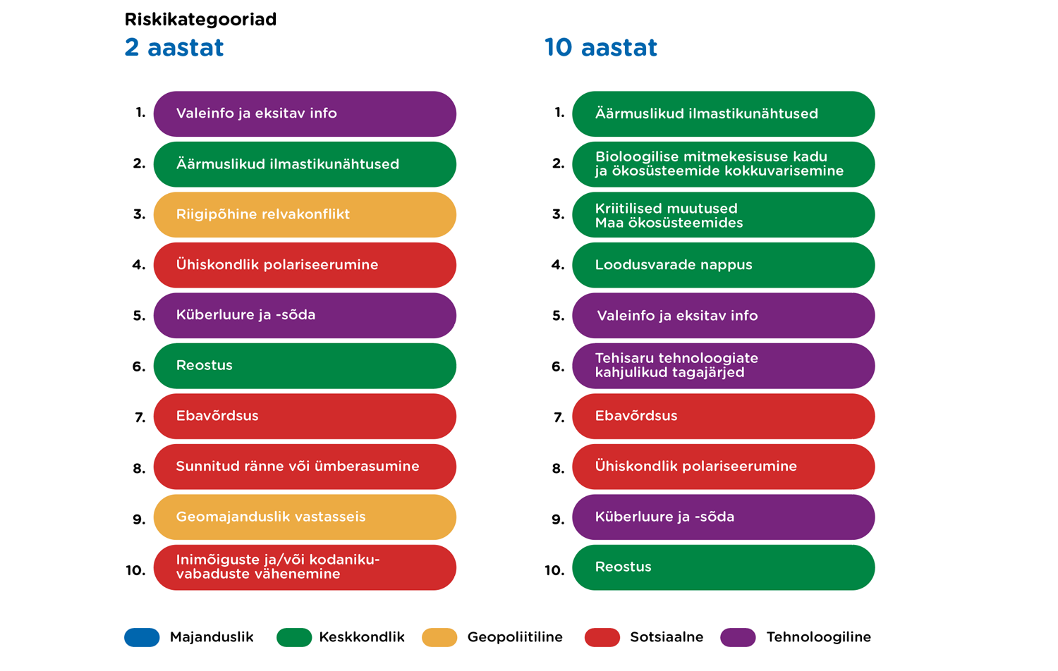 2. Poliitika ja valitsemine. Efektiivne poliitika peab arvestama üleilmseid riske, nagu kliimamuutused, loodusõnnetused ja elurikkuse kadu. Globaalse koostöö saavutamine muutub keerulisemaks, kuna võtmerollis olevad riigid näevad üksteist üha enam rivaalide, mitte partneritena. Autokraatlikud tendentsid kasvavad ka demokraatiates endis. Lühemas vaates mõjutavad poliitilist stabiilsust majanduslikud ja geopoliitilised riskid, kuid pikemas vaates tõusevad esikohale kliima- ja loodusprobleemid. Liberaalsete demokraatiate arv on viimase kümnendi jooksul vähenenud, autokraatlike riikide arv kasvanud, samas kui rahulolematus valitsemisvormidega on osas riikides tõusnud.